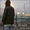 Description: Back shot of broody Duncan MacLeod; text reads, "with my sheild or on it"